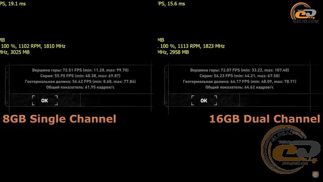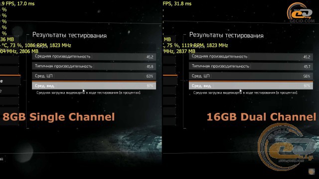 Вимоглива Rise of the Tomb Raider з високим профілем графічних налаштувань відразу ж показала, що навантаження на процесор в системі з двоканальним режимом роботи ОЗУ може бути навіть на 50% нижче, особливо в важких сценах. У той же час споживання оперативної пам'яті було на 100 МБ вище. В останній же сцені споживання ОЗУ вирівнялося, зате спостерігався дуже високий перевага як у завантаженні процесора, так і в рівні FPS на користь системи з двоканальним режимом роботи ОЗУ. У числовому еквіваленті різниця в швидкості склала майже 8 кадрів / с або 14%. Але в цілому по бенчмарку різниця досягла лише 3 FPS, тобто тільки 4%.