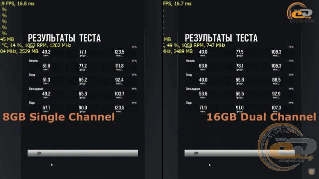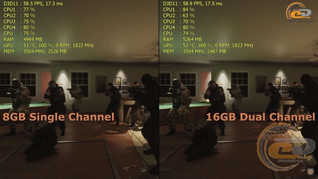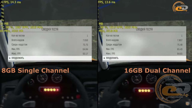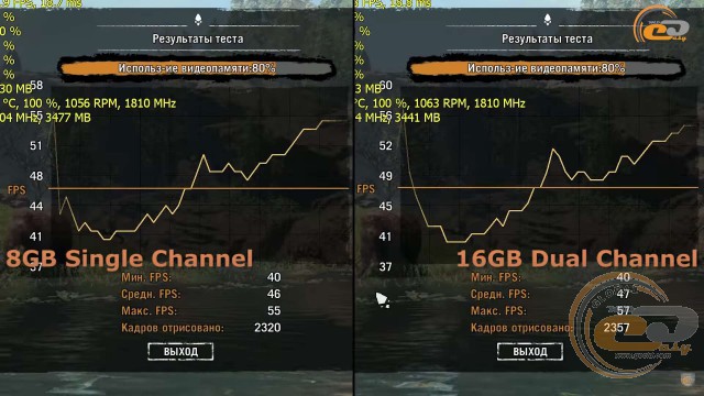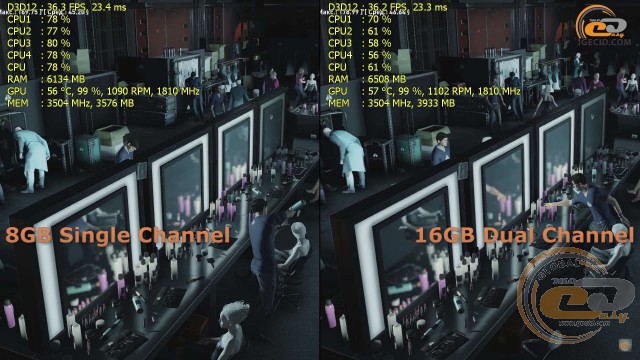 HITMAN з високим рівнем деталізації і якістю текстур показав аналогічну тенденцію: споживання ОЗУ в двоканальному режимі вище орієнтовно на 350 МБ, зате CPU місцями завантажений на 10-15% менше, тому у нього залишається більше ресурсів для фонових процесів. Різниця ж в частоті кадрів мінімальна. Якщо точніше, то в середньому менше 1 кадру / с.