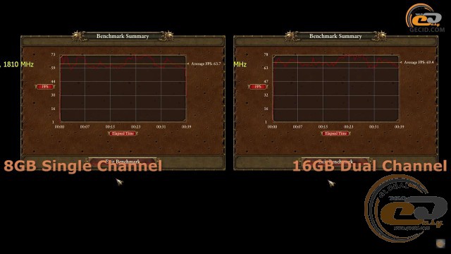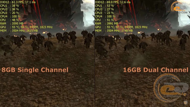 Ультра високий пресет графіки в режимі DirectX 12 в бенчмарке Total War WARHAMMER дозволив зафіксувати більш високу різницю в середньому рівні FPS: 64 проти 69 кадрів / с на користь двоканального режиму, що еквівалентно збільшенню в 9%. Споживання ОЗУ в одноканальному режимі було трохи вище 3,5 ГБ, а в двоканальному воно досягало 4 ГБ. Навантаження на процесор в обох режимах була практично однаковою.