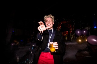 Парень поджимает губы. Это атмосфера вечеринки.