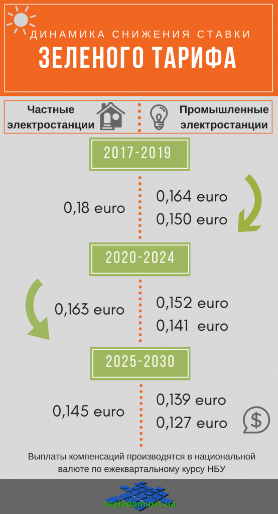 Вартість викупу електроенергії по умови зеленого тарифу зафіксована в євро. Щокварталу відбувається перерахунок вартості викупу в національній валюті в залежності від коливання курсу євро / гривня.