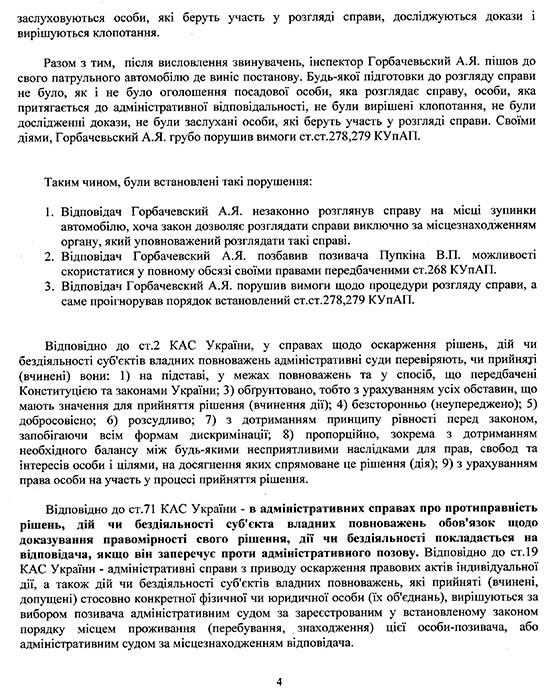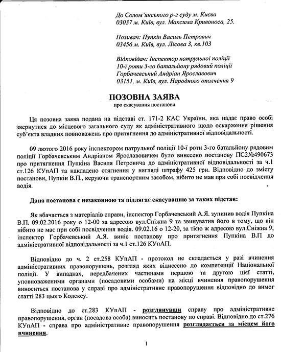 Позовна заява необхідно модифікувати під конкретну справу із зазначенням конкретних обставин. Якщо поліцейський не надав доказів порушення, це також необхідно вказати в позові. Відсутність доказів - це окреме підстава для скасування штрафу. В сукупності - відсутність доказів і порушення процедури розгляду, є відмінним аргументом для судді задовольнити позов проти поліцейського.