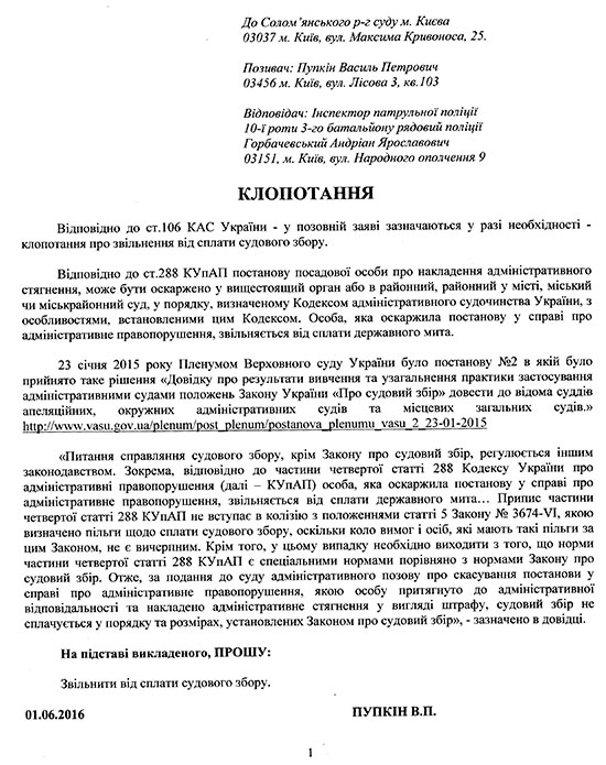 Однак, мало хто знає, що судовий збір за скасування штрафи поліції платити не потрібно. 23 січня 2015 Пленум Вищого Адміністративного суду України прийняв наступне рішення: