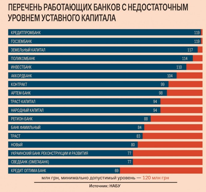 У 17 невеликих банків взагалі питання докапіталізації стоїть дуже гостро - їх статутний капітал менше необхідних 120 млн грн (див. Інфографіку). Наприклад, статутний капітал банку «Контракт» становить всього 86 млн грн. У вересні банк уже випустив акції на 128 млн грн, але поки їх ніхто не купив і статутний капітал фінустанови як і раніше менше необхідного мінімуму. При цьому показник достатності регулятивного капіталу банку на межі - 10,06% при мінімально необхідних 10%.