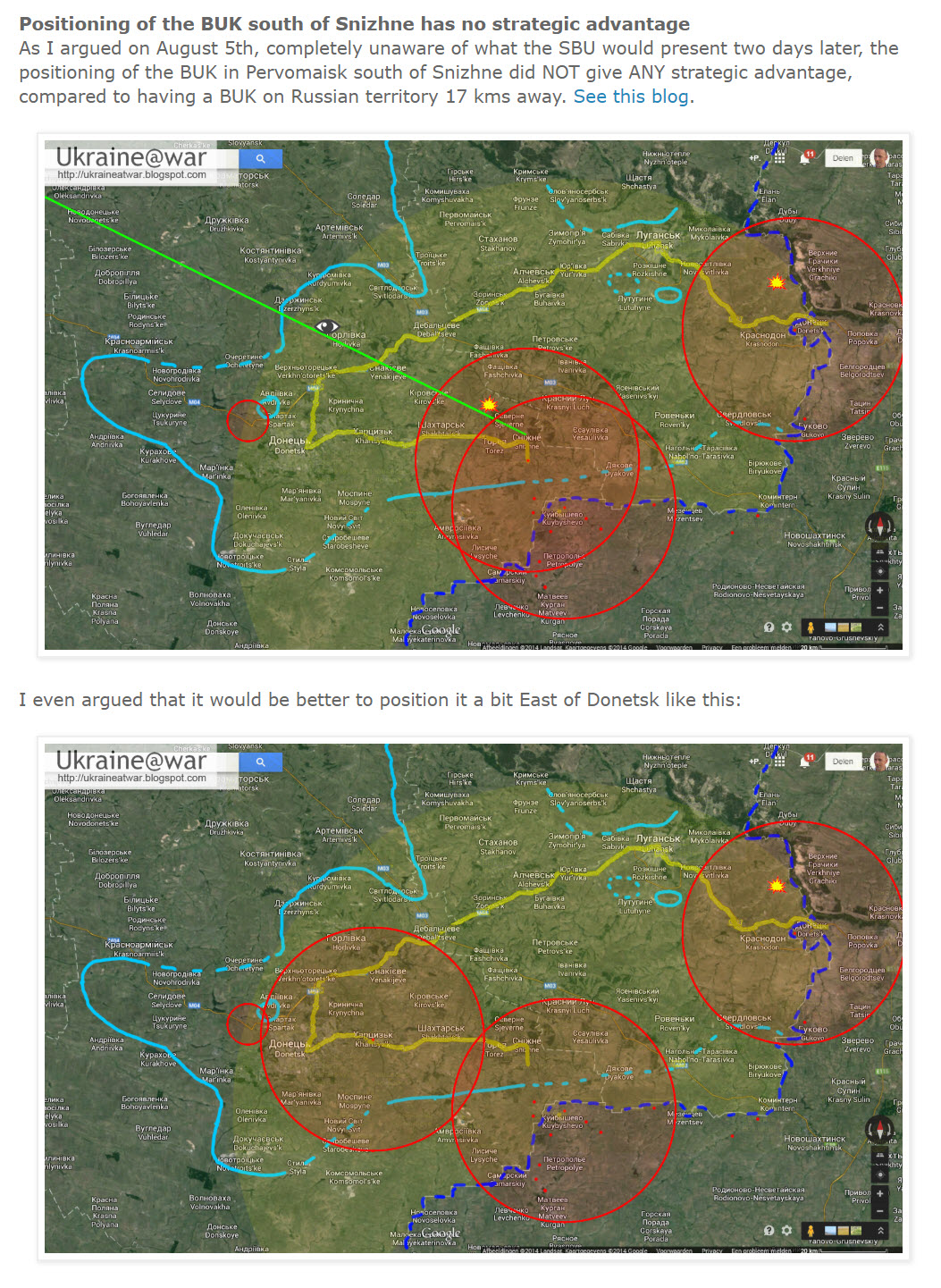 Про цей момент прямо говорив блогер Ukraine @ War / Dajey Petros . На його думку, місце пуску ракети «Бука» було вибрано помилково, оскільки не мало стратегічної цінності в порівнянні з більш західними місцями пуску. Це твердження засноване на тому, що в цьому районі вже було прикриття російських систем ППО по той бік кордону, тоді як Донецьк був порівняно не прикритий ППО. Ukraine @ War представив дві карти з накладеними радіусами дії «Бука» (див. Скріншот нижче):