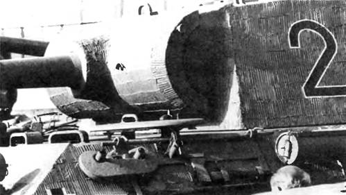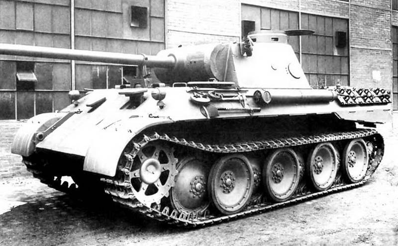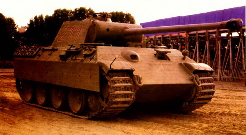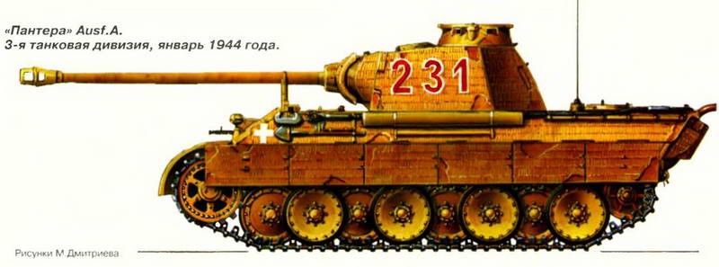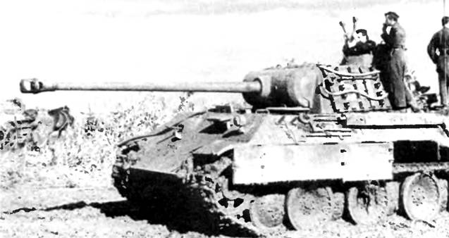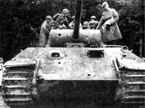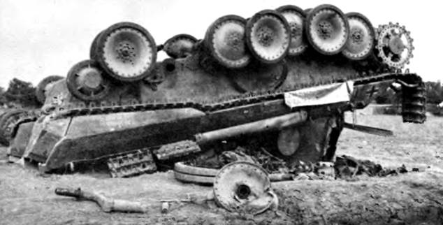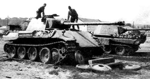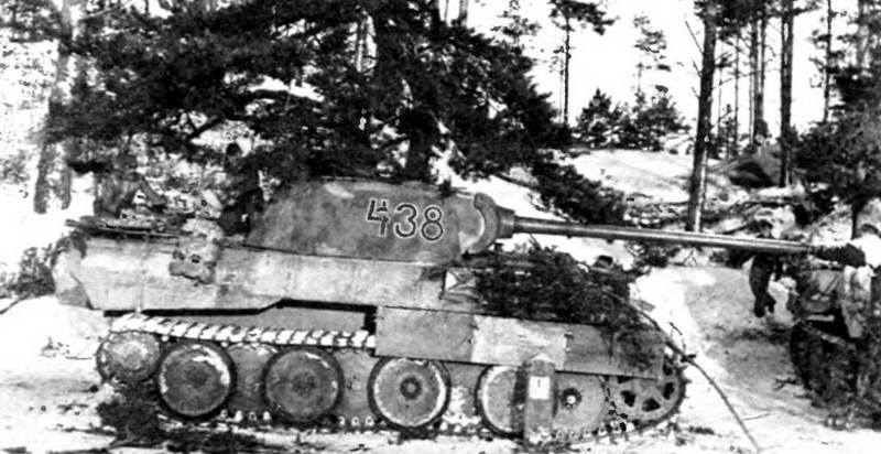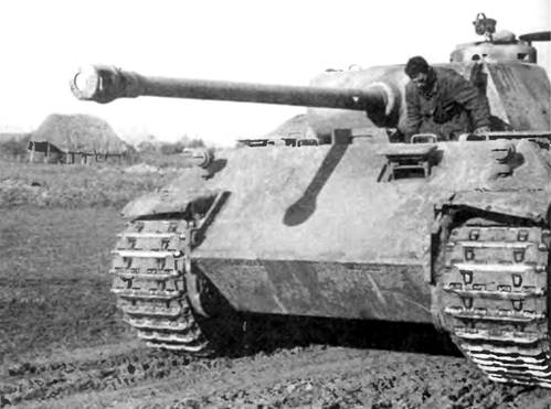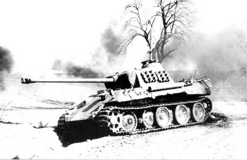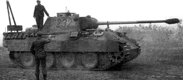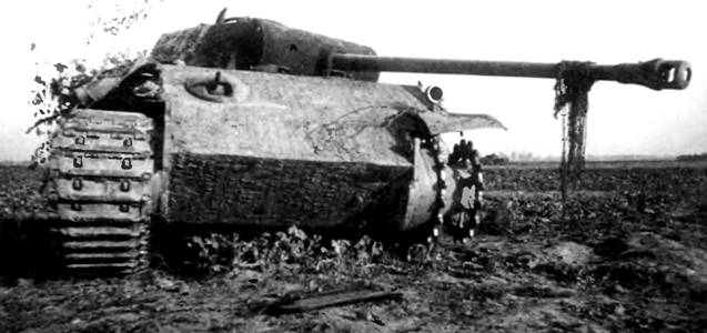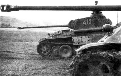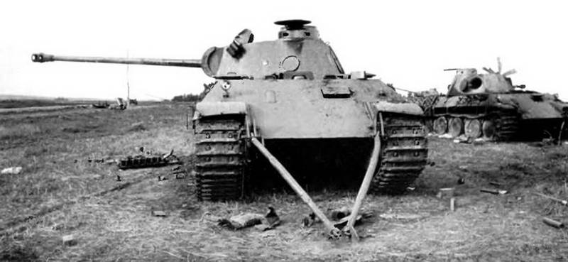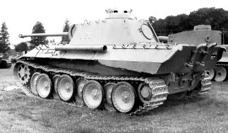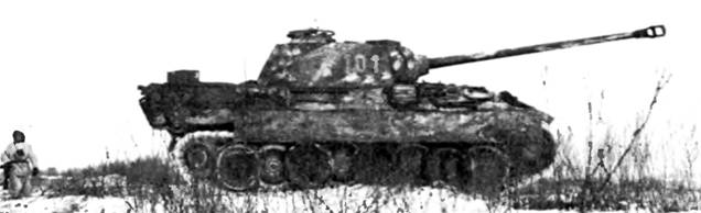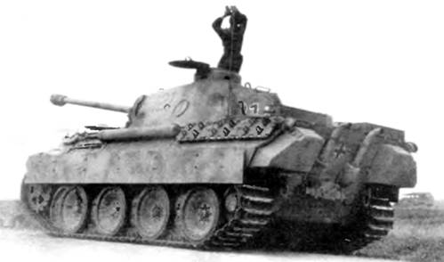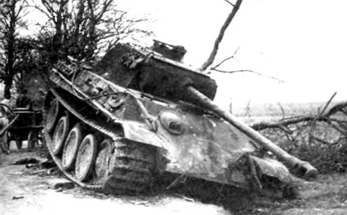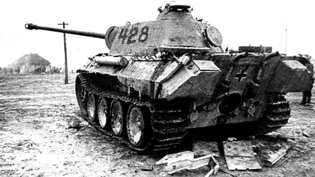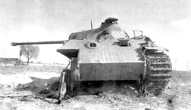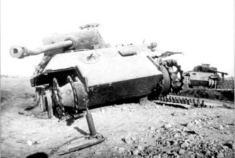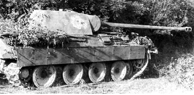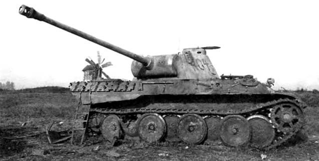 Підбита «Пантера» моделі А. У танка відсутній перший опорний каток з зовнішнього ряду. Навішування на борту башти запасних траків для додаткового захисту було звичайним явищем.