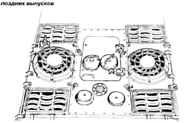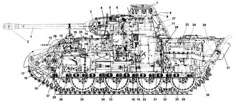 II - сидіння командира; 12 - кулемет MG 34; 13 панель приладів; 14 - радіостанція; 15 - сидіння навідника; 16 - сидіння заряджаючого; 17 - педаль зчеплення; 18 - педаль гальма; 19 - педаль а «селера тора: 20 - коробка передач; 21 - акумуляторна батарея, 22 - компресор вентилятора; 23 - двигун Maybach HL 230Р30; 24 повітряний фільтр; 25 - масляний радіатор, 26 - генератор; 27 - кормовий баштовий люк; 28 - балон автоматичної системи пожежогасіння; 29 - бак системи охолодження; 30 - вихлопної колектор; 31 - ящик для амуніції; 32 - масляний фільтр; 33 - редуктор механізму повороту вежі; 34 - карданний вал; 35 - головний фрикціон. 36 - сидіння водія; 37 - механізм повороту, 38 - прилад спостереження водія; 39 - гідроциліндр відкривання люка.