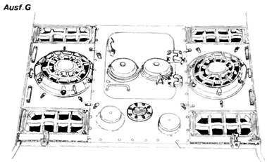 I - 75-мм танкова гармата KwK 42 L / 70; 2 - дуловий гальмо; 3 маска гармати; 4 - телескопічний монокулярний приціл TZF 12Ь; 5 - боєкомплект 7,92-мм патронів, 6 - баштовий вентилятор; 7 - рейок для кріплення зенітного кулемета; 8 - командирська башточка; 9 - прилад спостереження, 10 - вентилятор корпусу;