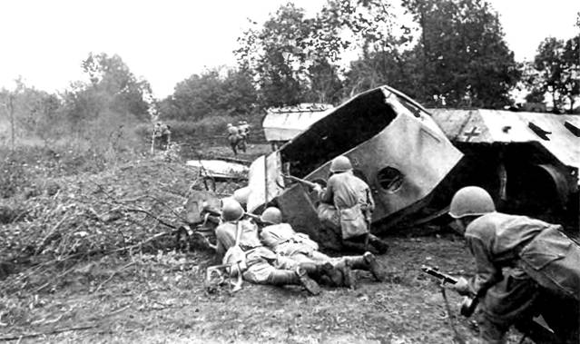 Канадці пострілом з базуки тут же знищили його машину. У світлі пожеж та освітлювальних ракет почалася безладна стрілянина в різних напрямках. Після того, як протитанкові гармати і ба- * укі канадців знищили шість «пантер», німці відійшли.