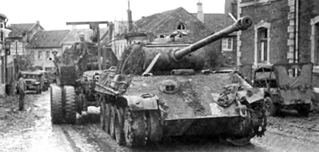 Американський танковий транспортер-тягач буксирує кинуту німцями «Пантеру» моделі G 1944 рік.