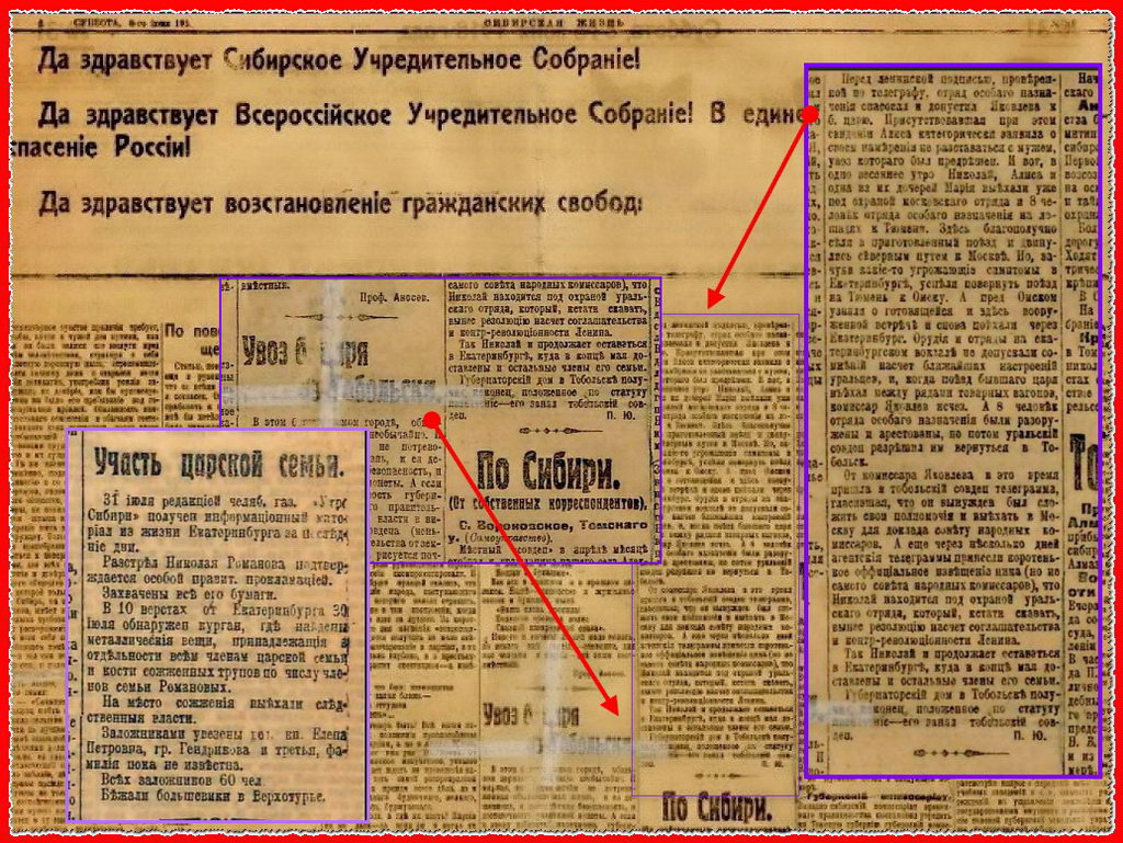 Далі: газета Тимчасового Сибірського Уряду «Сибірська життя» 8. червня 1918 року повні відомості про зміст царської сім'ї в Тобольську і її переклад «вимушений» в Єкатеринбург: (скан газети в заголовку),