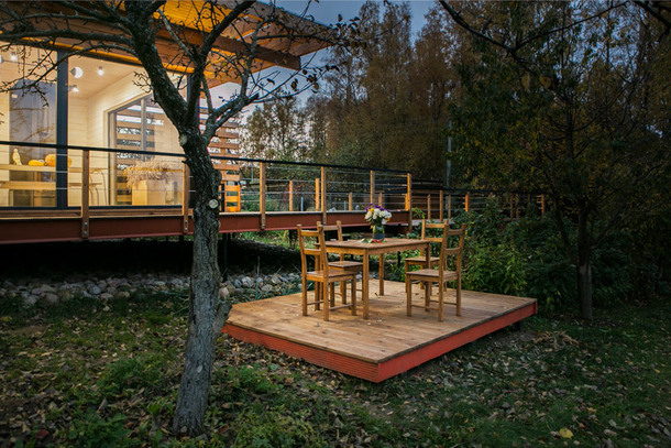На прохання мами Андрусь зберіг природний ландшафт і всі рослини на ділянці. Вийшло, що невелика споруда на ньому губилася, тому він спроектував тераси, які візуально зробили будова більше. Одну з терас можна порівняти з капітановим містком: вона йде від будинку до вишні, що росте недалеко. Перепад висот навіть на такому невеликому відстані - два метри, тому, підійшовши до дерева, опиняєшся на рівні його крони. У підлозі спеціально прорізані отвори для гілок. "Коли дерево плодоносить, можна поставити під ним крісло і їсти ягоди прямо з гілок", - говорить архітектор.