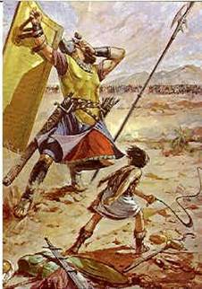 Одного разу пішли филистимляни війною проти Саула. І вийшов з лав їх величезний Голіаф. В поєдинок з велетнем наважився вступити лише Давид, молодий пастушок. Влучним кидком із пращі побив Давид величезного велетня. Упав Голіаф на землю, а Давид вихопив у нього меч і відрубав голову (рис. 3).