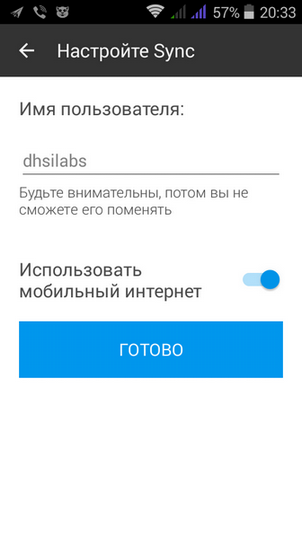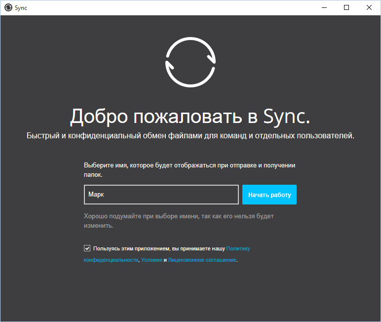 При першому запуску Sync вам буде запропоновано встановити ім'я, яке буде відображатися при відправці та отриманні папок - це ім'я побачать на інших пристроях. Ім'я встановлюється один раз і ви більше не зможете його змінити (рис. 5).