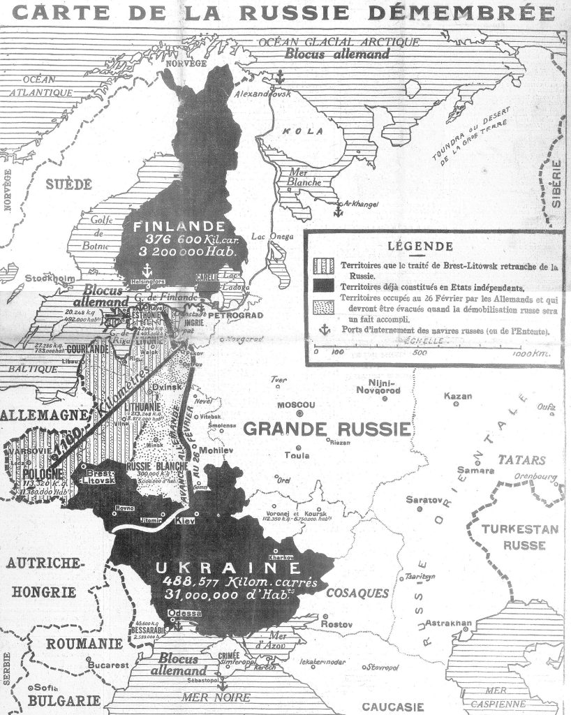 Французька карта демонструє ситуацію, що мала місце між підписанням українського і російського Брест-Литовських угод. У публікації стверджується, що Брест-Литовський договір дивовижно змінив карту імперії російських царів.