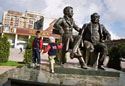 Народ стривожився. На лавці сидять двоє: один худий, з паличкою, що нагадує чомусь кенгуру, і другий - товстий, огрядний, сумний. Лавка виконана з бронзи в стилі залізно-балкових інсталяцій: брусок, брусок, ще брусок - вийшло сидіння.