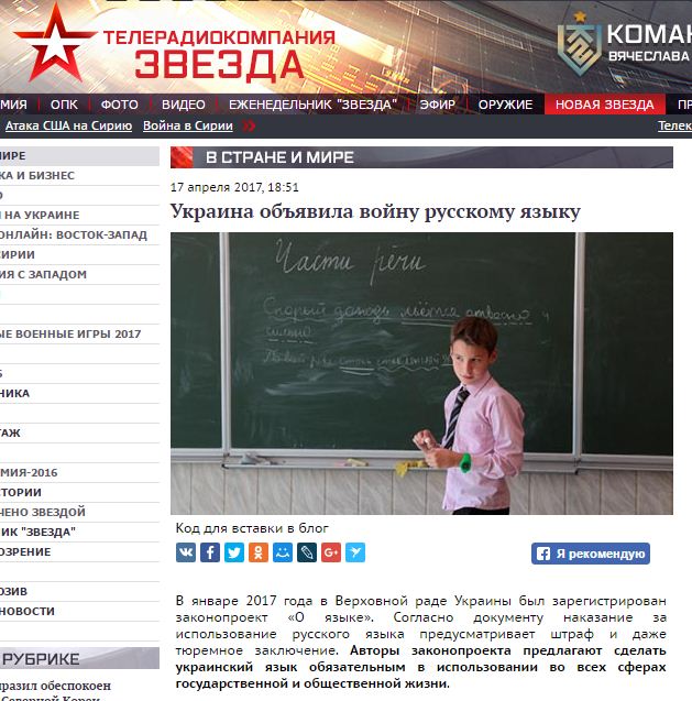 Пропагандистський російський телеканал «Звезда» знову вирішив опублікувати фейк на тему державної мови в Україні. 17 квітня на сайті телеканалу з'явилася стаття під заголовком «Україна оголосила війну російській мові» , Де повторила свій старий фейк ще з січня 2017 року, який StopFake вже спростовував . Також «Зірка» додала, що «покарання за використання російської мови передбачає штраф і навіть тюремне ув'язнення».