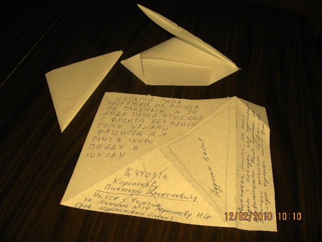Листи "трикутником" йшли не тільки з фронту, але і на фронт. Такі "трикутники" НЕ заклеюють, а складалися особливим чином. Таким способом вирішувалися два завдання: немає необхідності в конверті, і надавався легкий доступ для військових цензорів.