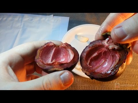 - 2. Другий спосіб має на увазі круговий розрізання шкірки плоду збоку, що в подальшому дає можливість відкрити верхню кришку мангустіна і витягнути м'якоть.