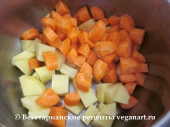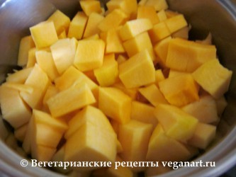 - Очищаємо всі приготовані овочі: гарбуз, картопля і морква. Ріжемо картоплю на кубики.