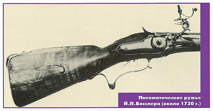 Також оформив свою рушницю Ф.Й. Босслер з Дармштадта вже в 1750 р - пневматичні рушниці сім'ї Босслеров, що робилися в 1730-1750-х рр., Користувалися гарною репутацією і непогано купувалися. У 1790 р Мейер виготовив рушницю з балоном для стисненого повітря, який дозволяв зробити кілька пострілів підряд. У музеї Метрополітен в Нью-Йорку зберігається оригінальне дульнозарядное двоствольну рушницю, створене майстром Ла Моттом в Сент-Етьєні в 1780 р Лівий стовбур розрахований на пороховий заряд і забезпечений звичайним ударним кремінним замком, а правий - пневматичний, забезпечений балоном зі стисненим повітрям, хоча зовні оформлений також і навіть має фальшивий курок.