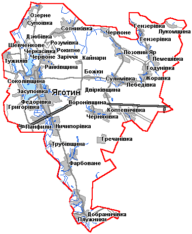 Сільські ради: Богдановський, Годуновській, Дворковщінській, Жоравській, Засупоевскій, Капустинський, Кулябовській, Лемешовскій, Лозовояровскій, Нічіпоровскій, ПАНФИЛЬСЬКОЇ, Райковщінкій, Сотніковскій, Сулімовський, Супоївське, Фарбованскій, Червоненський, Черняховський і Яготинський міська рада.