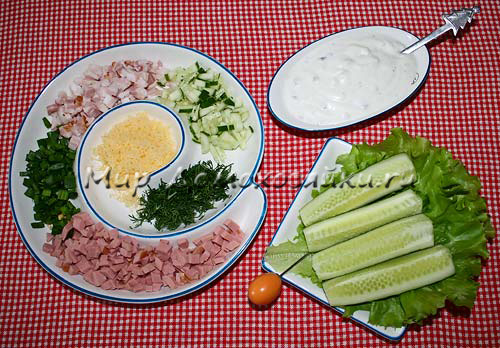 Поки картопля запікається, готуємо різні наповнювачі. У мене була молочна варена ковбаска, копчена грудинка, свіжий огірочок, тертий сир, зелена цибуля і кріп. Все дрібно нарізаємо і укладаємо красиво на тарілочки.