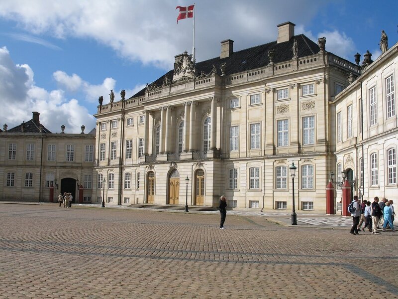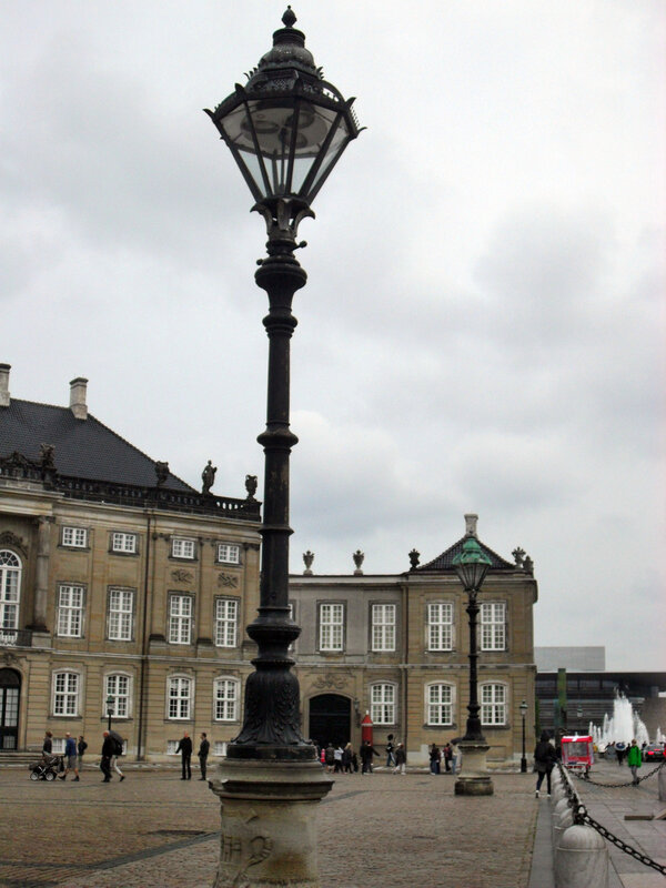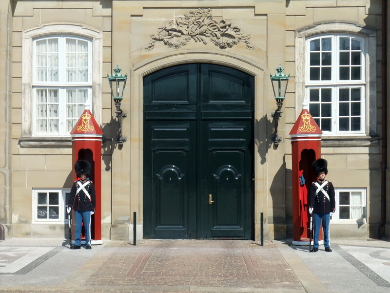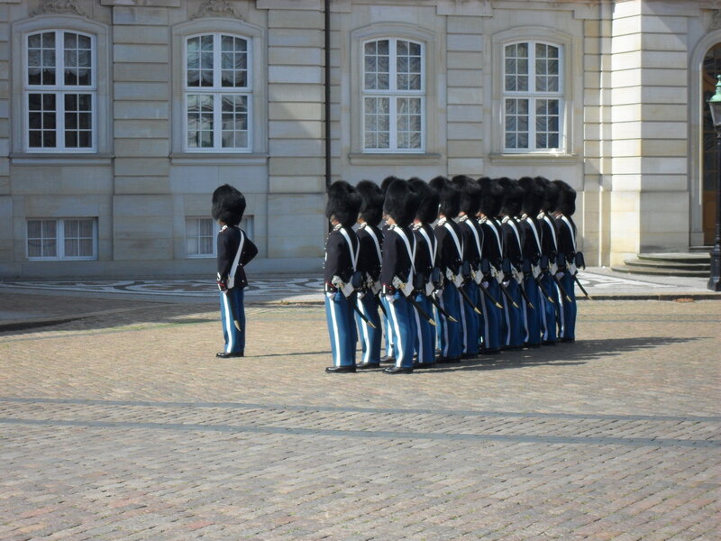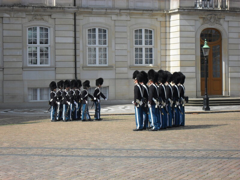 Відвідування цього палацу було заплановано у мене прямо після Розенборг, причому я так розрахував час, щоб опинитися на площі Амалиенборг приблизно за чверть опівдні. Саме в цей час відбувається зміна лейб-гвардійського варти. На жаль, мені не пощастило побачити цю церемонію в парадному форматі, з музикою. Справа в тому, що в такому форматі вона буває тільки коли в палаці знаходиться правлячий Монарх (зараз це Маргарита II). А в день моїх відвідин її якраз не було в Амалиенборг (але перші знімки палацу з розвівається прапором зроблені в дні перебування там Королеви).
