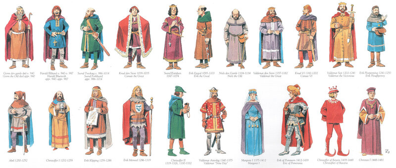 У цих малюнках є щось від казок Андерсена. Цікаві прізвиська були у трьох датських Королів: у Харальда I - Синьозубий (через темного кольору зубів - в старі часи слово blå означало колір набагато більш синій, ніж згодом, його прізвисько в наш час стало позначенням виду бездротової мережевої технології - так як технологія ця з'явилася якраз на території сучасної Скандинавії, а також тому, що Харальд об'єднував народи, подібно до того, як Bluetooth об'єднує електронні пристрої); у Свена I - Вилобородий (на малюнку він так і зображений, хоча насправді подібними вілам у нього були вуса, а не борода): у Еріка IV - Плужне Гріш (за податок з плугів, який викликав селянське повстання).
