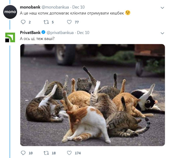 Перший, хто використовував кота в постах є ПриватБанк, так як кіт - це символ їх конкурентів - monobank.