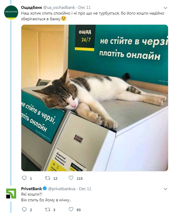 Користувач Kalmykoff виклав в Twitter фотографію банкомату ПриватБанку, на якому відпочиває кіт і підписали: "На зиму коти з @monobankua ̶ ̶̶̶у̶̶̶л̶̶̶е̶̶̶т̶̶̶а̶̶̶ю̶̶̶т̶̶̶ ̶̶̶в̶̶̶ ̶̶̶т̶̶̶е̶̶̶п̶̶̶л̶̶̶и̶̶̶е̶̶̶ ̶̶̶к̶̶̶р̶̶̶а̶̶̶я̶̶̶ йдуть @privatbankua".