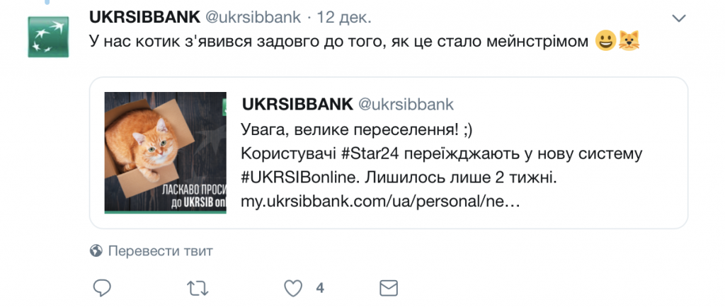 У бесіду втрутився Укрсиббанк, який нагадав, хто є зачинателем кото-мейнстріму.