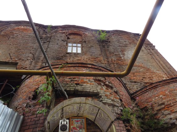 З Бутирській вулиці видно тільки дзвіниця - красива, недавно відреставрована, білосніжна. У церковній лавці запитуємо, як пройти до храму. Продавець дзвонить комусь по телефону і викликає до нас. Приходить людина і веде до будівлі бізнес-центру, на охорону каже: «Свої». Ми проходимо далі, потрапляємо в запущений двір, весь в будматеріалах і руїнах. «Ось і храм», - наш супроводжуючий вказує на масивну цегельну коробку.
