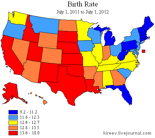 Особливо мені сподобалася карта народжуваності. Всі шість останніх місць списку займають всі шість штатів Нової Англії! Взагалі ж народжуваність нижче на північному сході, в штатах «іржавого пояса» Середнього Заходу, так само у Флориді, де багато людей похилого. Найвища рождамость мормонів Юти, на Алясці, де дуже молоде населення, і взагалі н Заході, в сільських штатах Середнього Заходу.