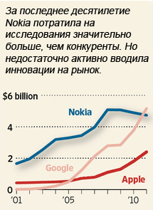 За останнє десятиліття Nokia витратила на дослідження 40 мільярдів доларів, що майже в чотири рази більше, ніж витратила за той же період Apple. Але фактично дослідження проводилися заради самих досліджень, наукові відділи просто конкурували між собою, і мало кому спадало на думку, що всі ці розробки потрібно направляти на розвиток компанії, на зміцнення її позицій на ринку, виробляти все нові програмні продукти і інноваційні пристрої. Керівництво Nokia вважало що можна обійтися і без цього.