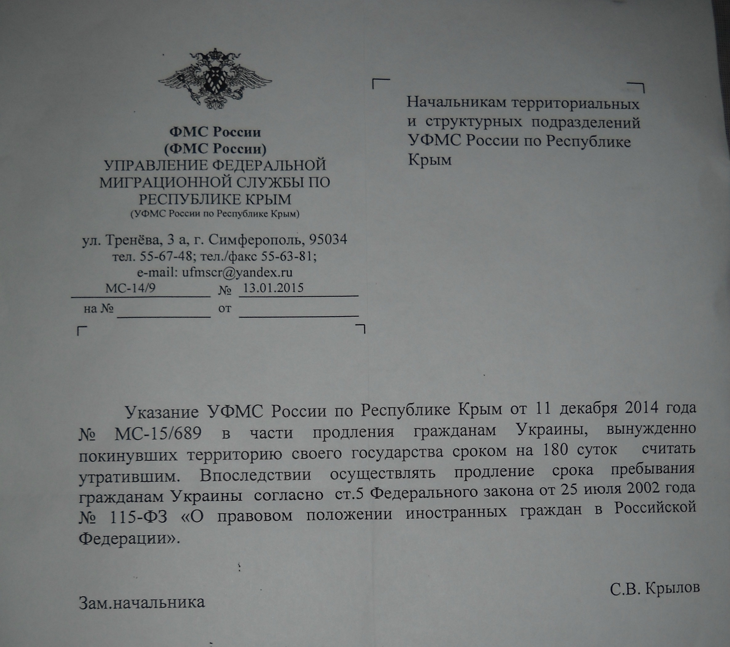 "Вказівка УФМС Росії по Республіці Крим від 11 грудня 2014 року № МС-15/689 в частині продовження громадянам України, які вимушено залишили територію своєї держави терміном на 180 діб вважати таким, що втратив. Згодом здійснювати продовження терміну перебування громадянам України згідно ст.5 Федерального закону від 25 липня 2002 року № 115-ФЗ "Про правове становище іноземних громадян у Російській Федерації".