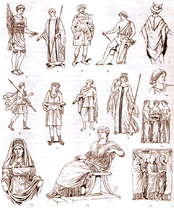 Якщо історія грецького костюма почалася з незвичайною азіатській строкатості, манірного пишноти і дріб'язкової штучності і завершилася шляхетною простотою, мальовничій широтою і великим малюнком складок, то костюм римлян змінювався в прямо протилежному напрямку: від простої, невибагливої форми до претензійної надмірності і помпезності.
