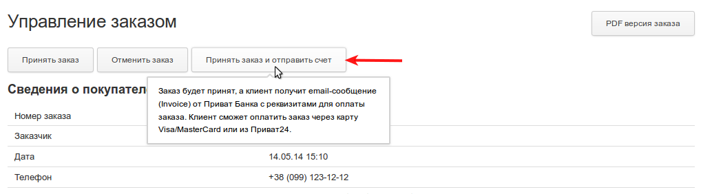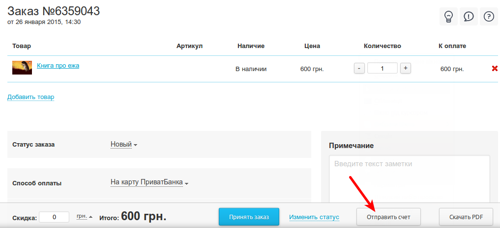 Для того, щоб виписати рахунок на оплату замовлення онлайн, в Кабінеті компанії, в розділі « замовлення »Просто відкрийте потрібний замовлення і натисніть кнопку« Прийняти замовлення і відправити рахунок », якщо ви використовуєте старі замовлення: