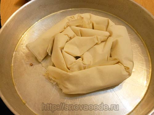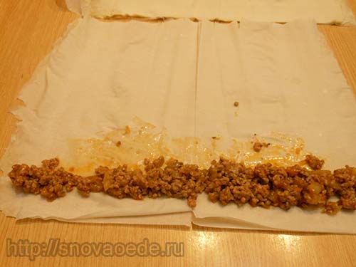 Готувати до повного випаровування рідини. У процесі приготування посолити і поперчити фарш. Готову начинку злегка остудити і потім можна приступати безпосередньо до приготування пирога. Для цього брати по 2-3 листків філо, на широкий край викладати частину начинки, і потім акуратно згортати в рулет.