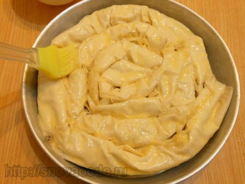 Пиріг змастити яйцем і поставити запікатися в розігріту до 180С духовку на 20-30 хвилин.
