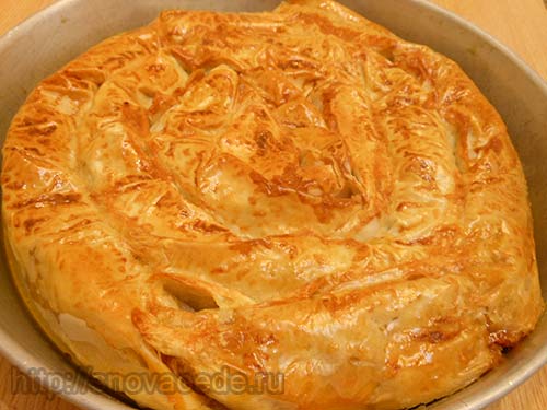 Як тільки пиріг покриється красивою золотистою скоринкою, його можна вийняти з духовки і подавати на стіл. Смачного.