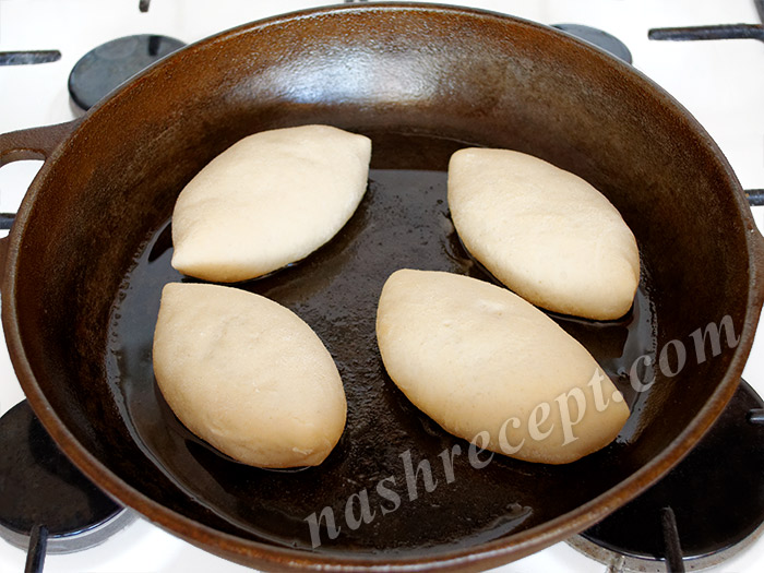 - Підійшли пиріжки викладаємо на гарячу сковорідку з олією. Накриваємо кришкою і смажимо на невеликому вогні до зарум'янювання (в середньому 5-6 хв.).