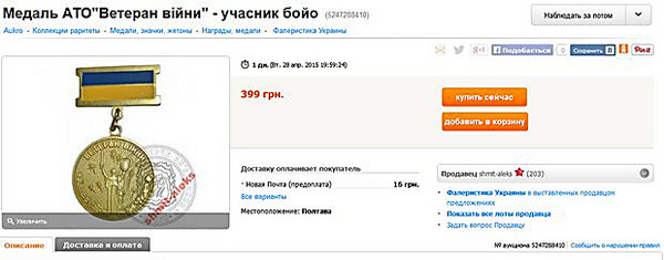 На торгових майданчиках в мережі Інтернет почали торгувати медалями за АТО, тоді як самі учасники операції не можуть їх отримати.
