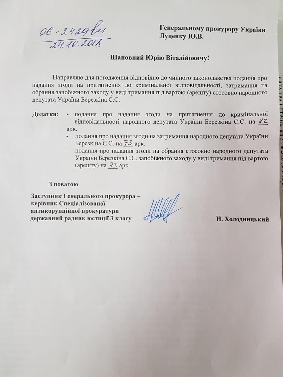"Сьогодні, з метою залучення всіх осіб, ймовірно причетних до вказаних злочинів, мною підписано і направлено Генеральному прокурору України подання про надання згоди на притягнення до кримінальної відповідальності, затримання і взяття під варту (арешт) народного депутата України Станіслава Березкіна Семеновича за ознаками злочинів, передбачених ч.3 ст.27, ч.5 ст.191 ч.3 ст.27, ч.3 ст.209 і ч.3 ст.27, ч.1 ст.366 КК України ", - йдеться в повідомленні.