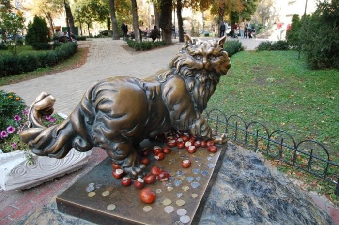 Неподалік на камені стоїть персидський кіт Пантюша. Це цілком реальний кіт, який жив тут при місцевому ресторані і був улюбленцем публіки. Його обожнювали і працівники, і відвідувачі, пестили й плекали, годували і пестили. Але якось раз в ресторані сталася пожежа, і бідолаха загинув, задихнувшись від їдкого диму. На згадку про нього тут же, в сквері, поряд з місцем трагедії і встановили цей монумент.