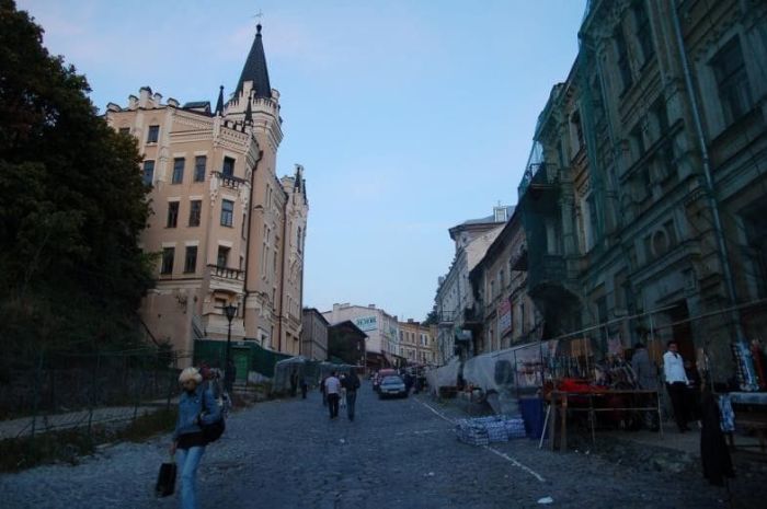 Почали романтичну прогулянку з Хрещатика, рухаючись по ньому в бік головної площі молодіжних і політичних тусовок - Майдану Незалежності, заглянули на Прорізну вулицю, на самому початку якої в тінистому дворику стоїть «головний жебрак і пройдисвіт Хрещатика» - Паніковський. Навпаки Прорізній вулиці стоїть будівля «Пасажу», завернули в арку і пропустили по чашечці кави з «київським Гауді» - архітектором Городецьким, саме незвичайне твір якого - Будинок з химерами.