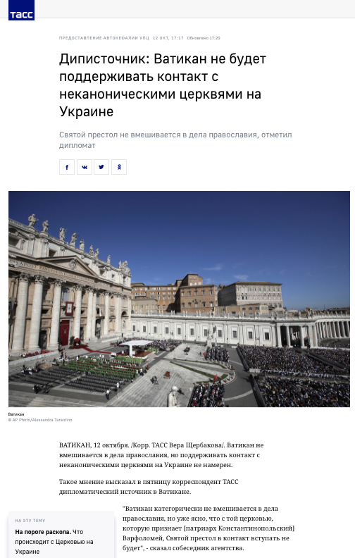 Також російськими ЗМІ поширювалася новина про те, що Ватикан нібито не буде контактувати з "неканонічною УПЦ". При цьому "неканонічною" називається та, "яку визнає патріарх Константинопольський Варфоломій", і джерелом інформації є неназваний "дипломатичне джерело в Ватикані".