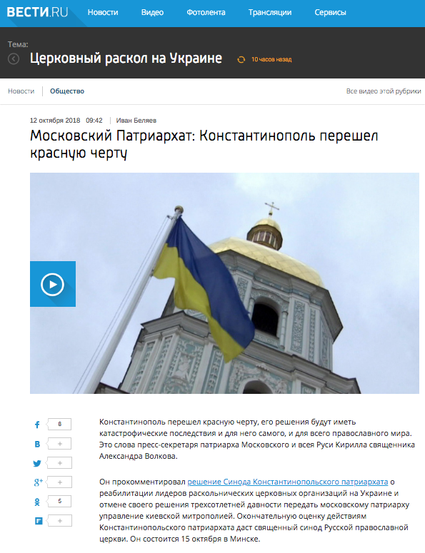 також Російська православна церква заявила , Що "Константинополь перейшов червону межу". "Eго рішення будуть мати катастрофічні наслідки і для нього самого, і для всього православного світу". У статті "Вістей" все звели до того, що рішення Стамбула було потрібно тільки українським політикам, які зняли з цієї "інформаційної піни" "політичні вершки", і "на цьому будуватимуть свої політичні кампанії". І саме тому Константинополь "не поспішає приймати рішення". Про це ж пише і "Комсомольська правда", стверджуючи, що "Автокефалія Порошенко намагається підняти свій рейтинг, але, тим самим, він себе поховає".
