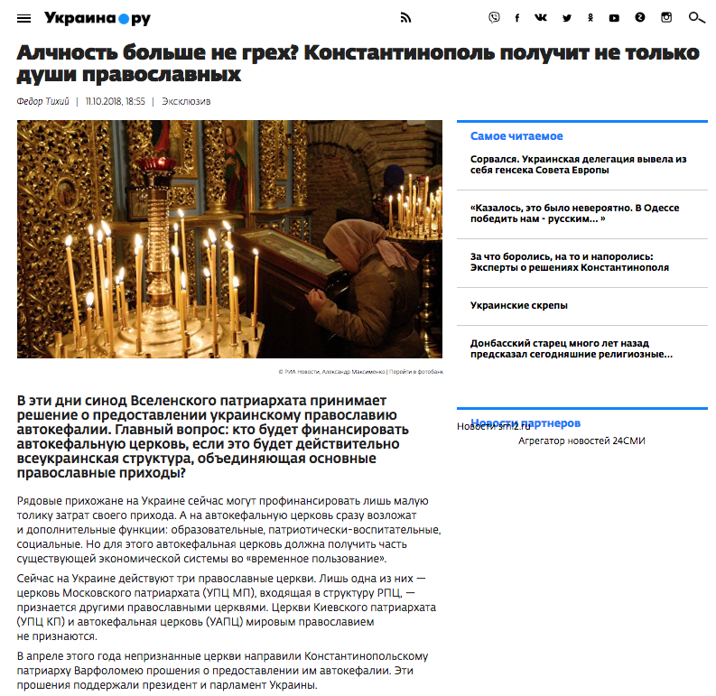 У статті Ukraina.ru "Жадібність більше не гріх? Константинополь отримає не тільки душі православних " стверджується, що з наданням томосу про автокефалію Україні Вселенський патріархат отримує "найбільший узагальнений прихід, а значить, і великі гроші". "Через лаври, розташовані на Україні, Варфоломій буде отримувати потік коштів від продажу іконок, свічок, церковних книг і благодійних пожертвувань, а також плати за проведення таїнств (хрещення, відспівування і ін.). Хоча крім священнослужителів навряд чи хтось знає більш-менш точні цифри цих зборів, насправді мова йде про значні фінансові потоки, вимірюваних мільйонами доларів ", - стверджують пропагандисти. Коментують тему, звично, політологи.