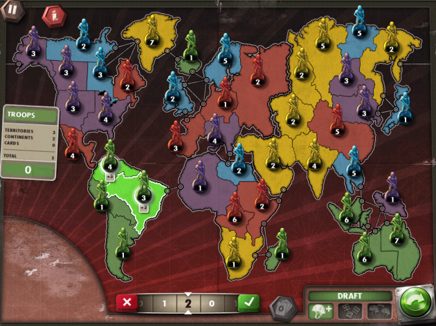 Якщо ви завоювали територію суперника, на неї автоматично переноситься частина ваших солдатів. За допомогою бігунка ви можете вказати, яка їх кількість залишити на колишній території. Там повинен залишитися як мінімум один солдат, інакше, хто ж її буде захищати? Коли під час своєї атаки ви знищуєте одного зі своїх суперників - до вас переходять всі його картки. Якщо в цей момент у вас на руках виявляється 5 або більше карток, вони автоматично обмінюються на додаткових солдатів, і ви знову можете зміцнити свої території.